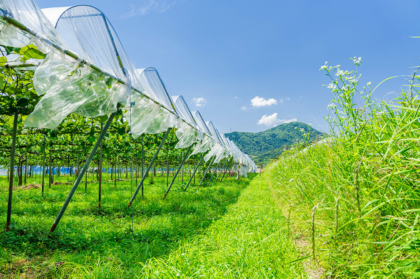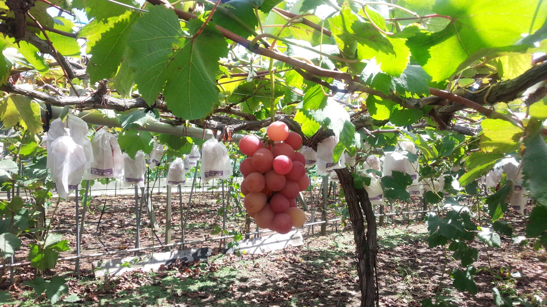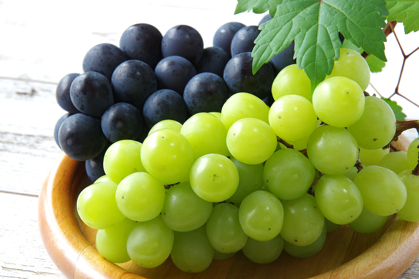 ピオーネは1957年に静岡で巨峰とカノンホールマスカットを交配して生まれました。強い甘みがありながら爽やかな酸味もあり、スッキリとした味が特徴的です。種無しになるようにジベレリン処理して栽培したものをニューピオーネと呼びます。朝倉岩下農園で栽培している品種は、このニューピオーネです。種の無いニューピオーネは子供にも大人気! 一粒が大きいのもニューピオーネの特徴です。