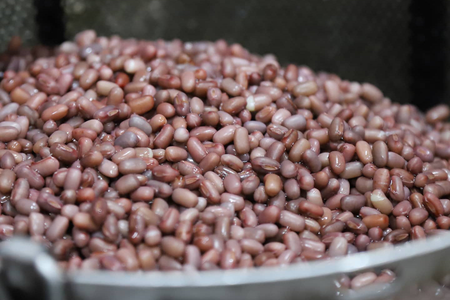 北海道産小豆の粒あんを一晩水につけ、砂糖と混ぜ合わせ粒あんを炊き上げます。炊き上げた小豆の粒あんと白の漉し餡をまぜると餡の出来上がりです。特に餡は練りすぎると舌に粘りが絡みすぎて後味が悪くなることから絶妙なバランスを突き詰めています。