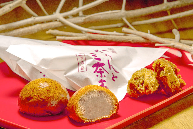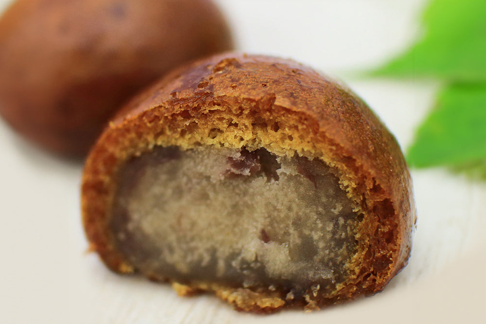 北海道産小豆の粒あんと白の漉し餡をブレンドしたつぶし餡。生地の黒糖・三奈木砂糖の風味を損なわぬよう程よい甘さの餡に仕上げております。