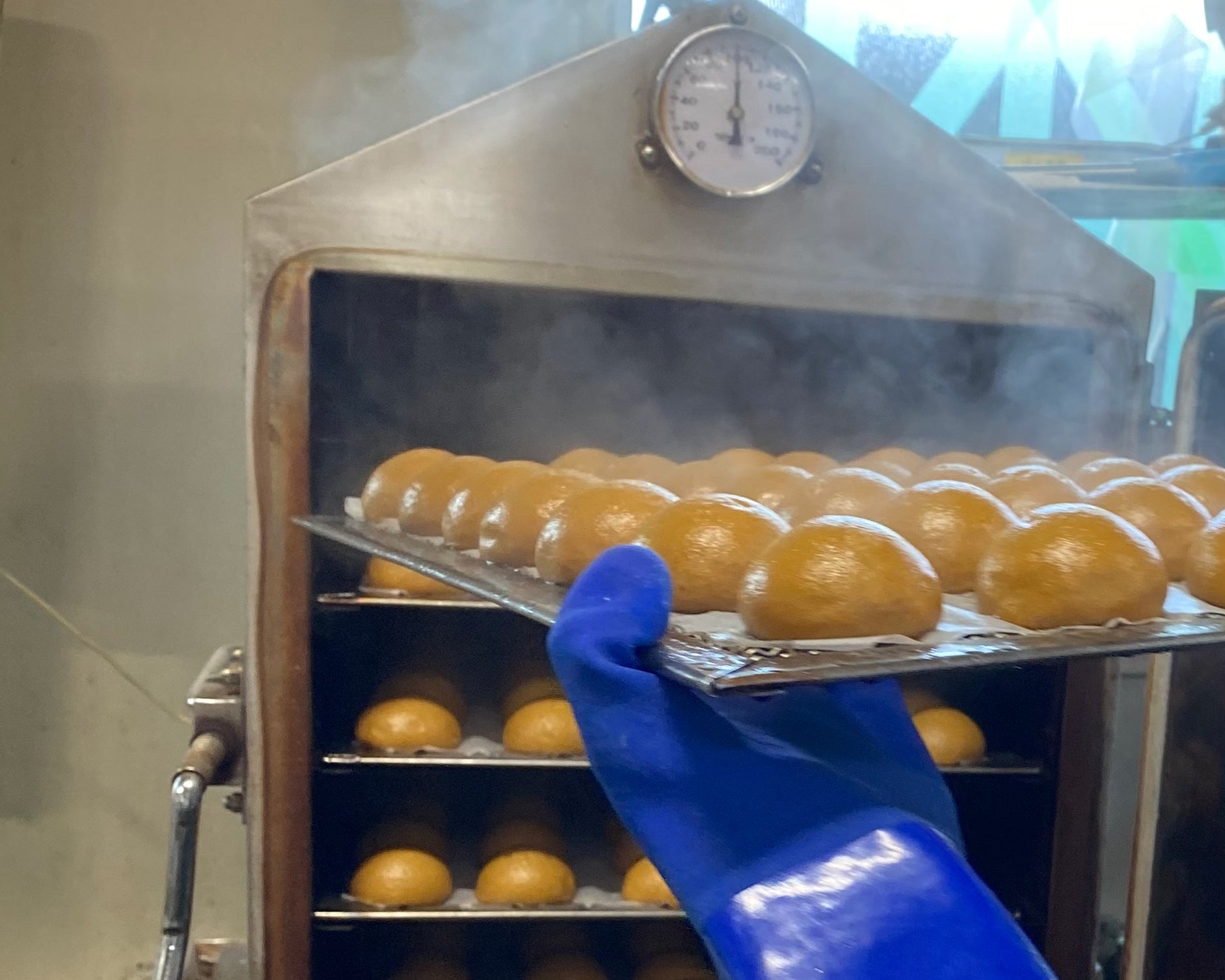包まれたお饅頭を蒸し網に並べ蒸し器で蒸していきます。火加減と蒸し時間が大切です。黒糖のお饅頭の香ばしさの加減がここで決まります。
